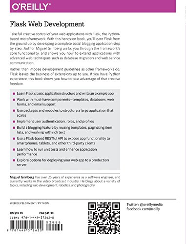 Take full creative control of your web applications with Flask, the Python-based microframework. With this hands-on book, you’ll learn Flask from the ground up by developing a complete social blogging application step-by-step. Author Miguel Grinberg walks you through the framework’s core functionality, and shows you how to extend applications with advanced web techniques such as database migration and web service communication. Rather than impose development guidelines as other frameworks do, Flask leaves the business of extensions up to you. If you have Python experience, this book shows you how to take advantage of that creative freedom.
